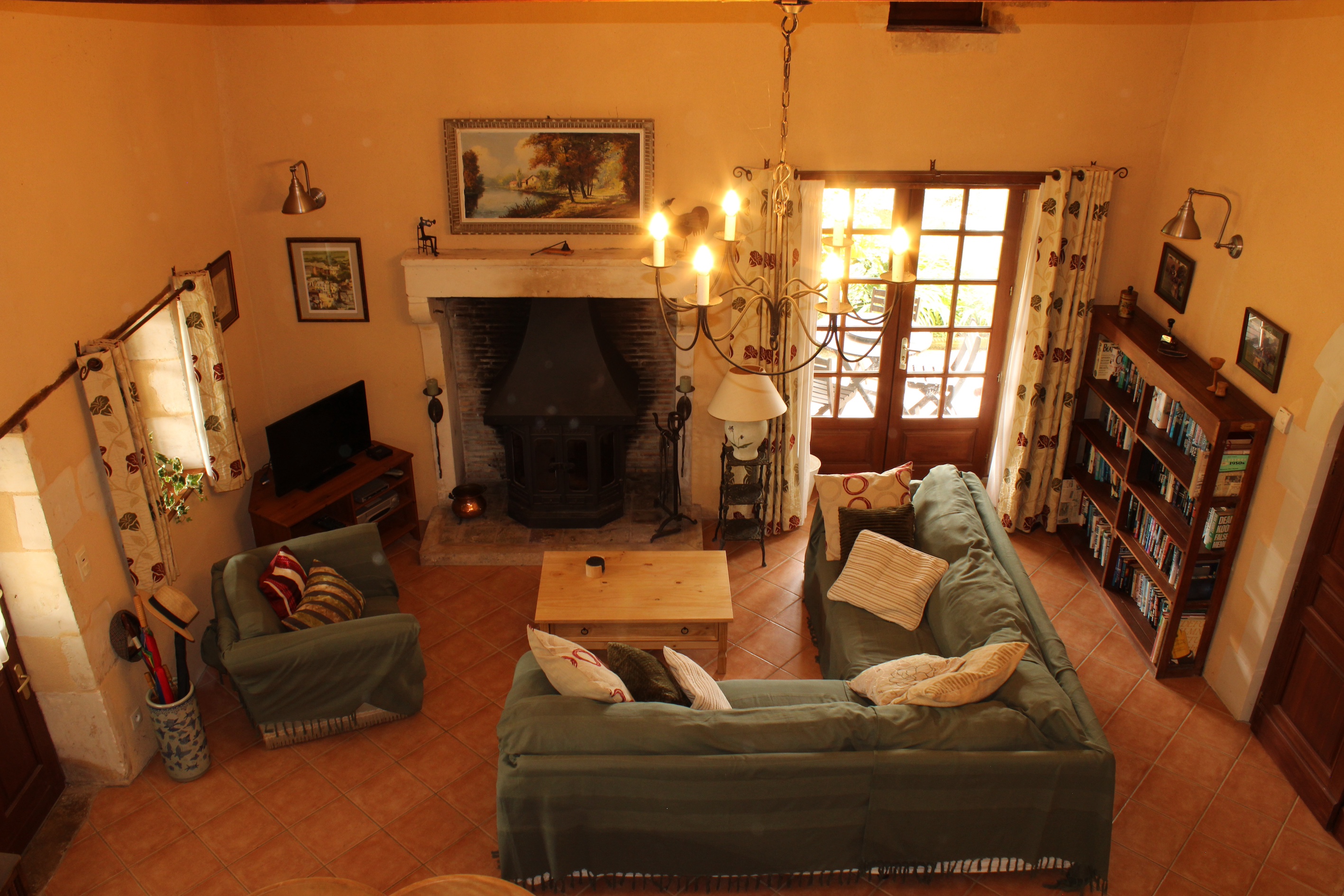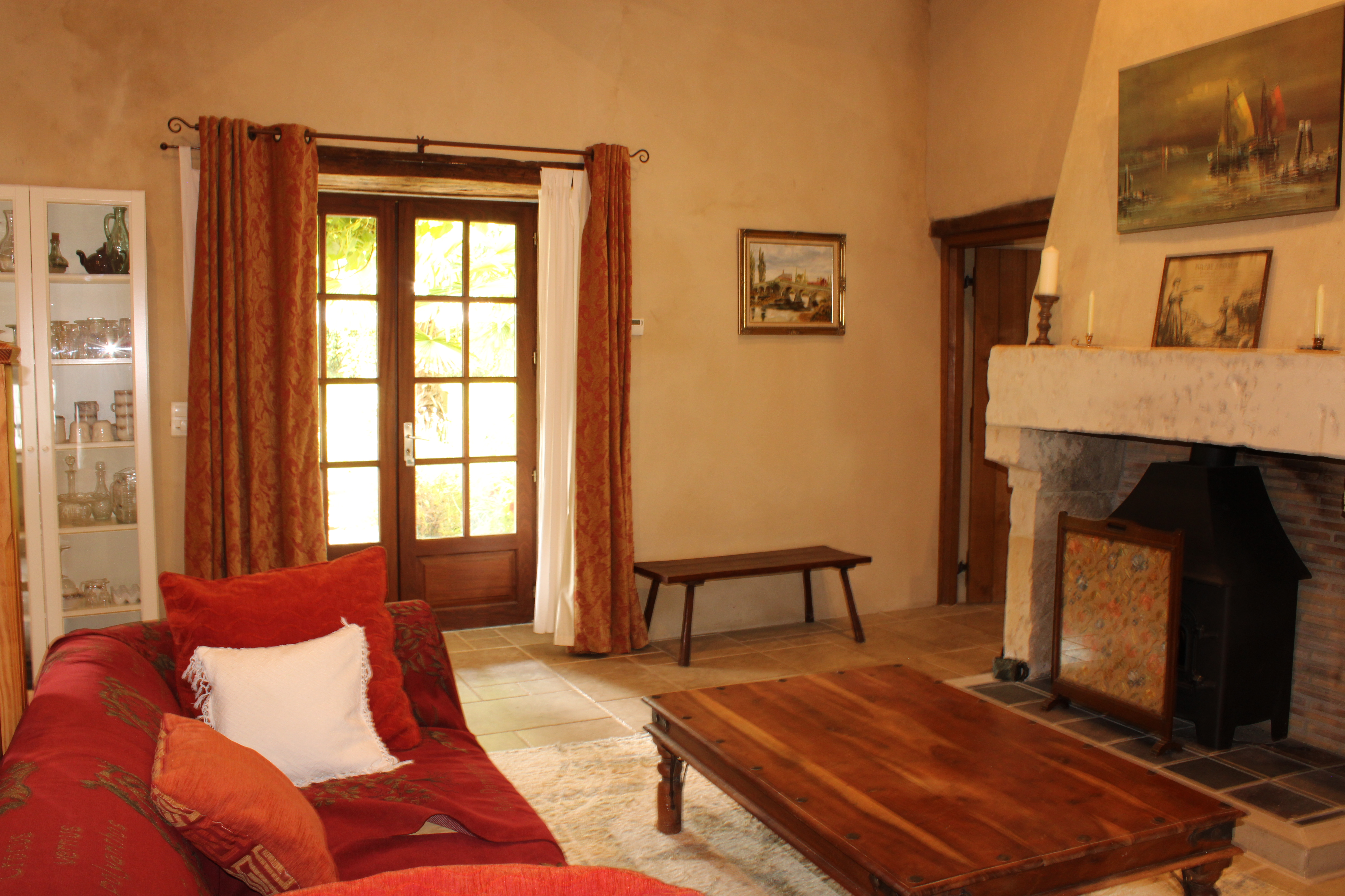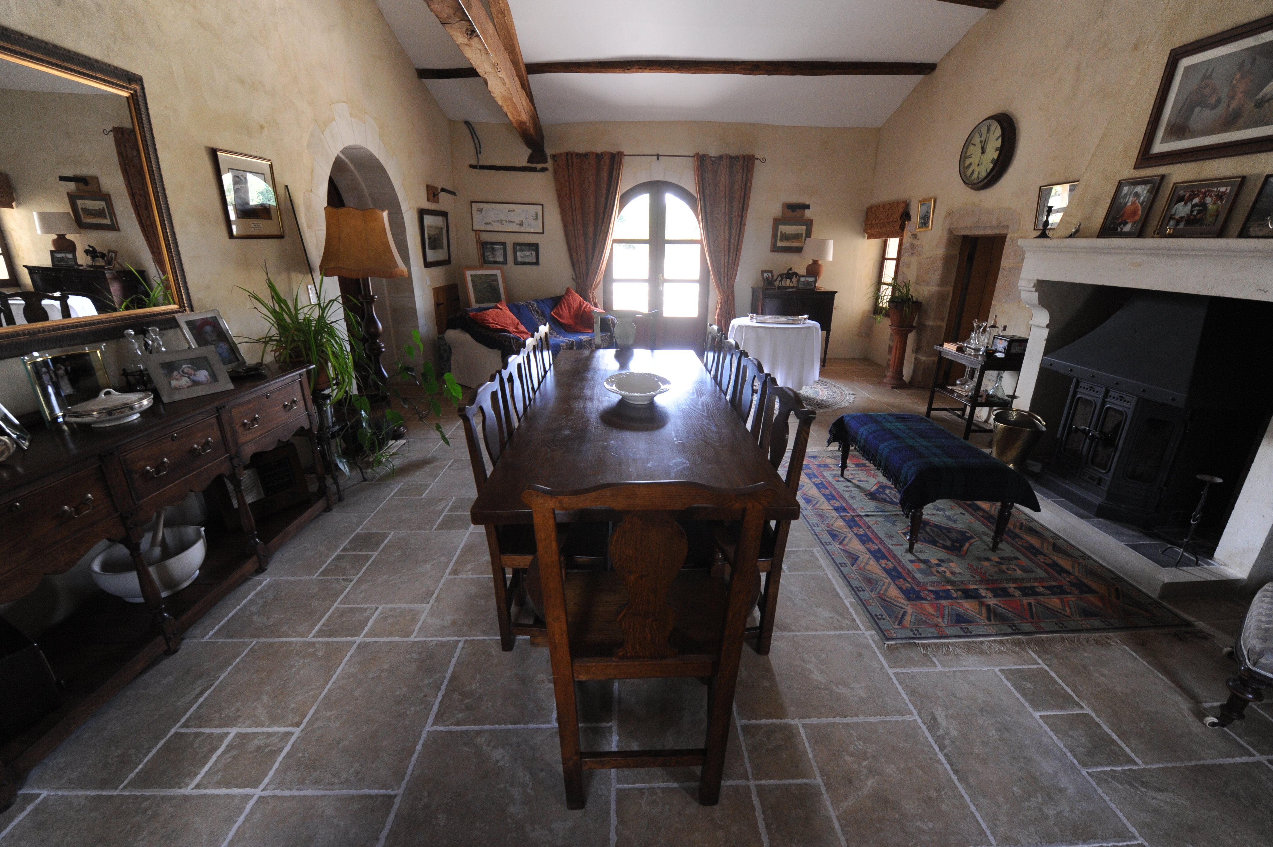 A large dining room, seating up to 10, with a large log burner joins the House and the Gite together, with south facing french doors all around the property opening onto the terrace for outdoor dining.