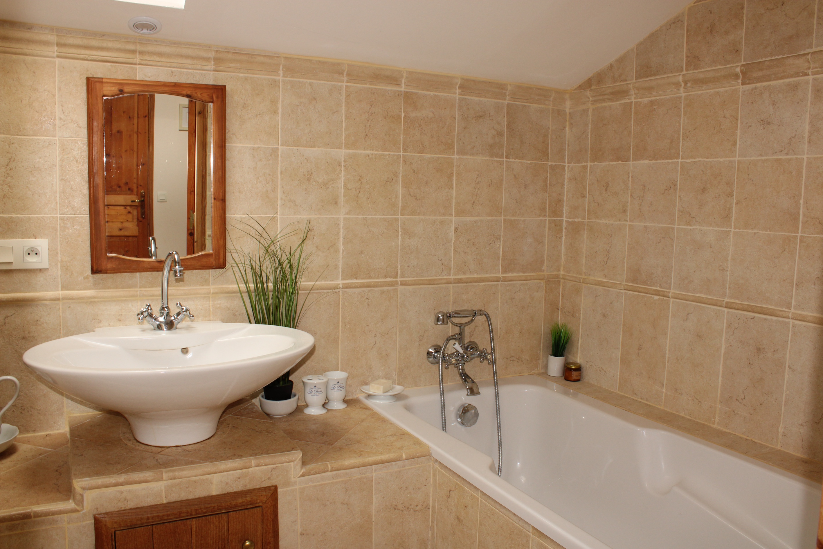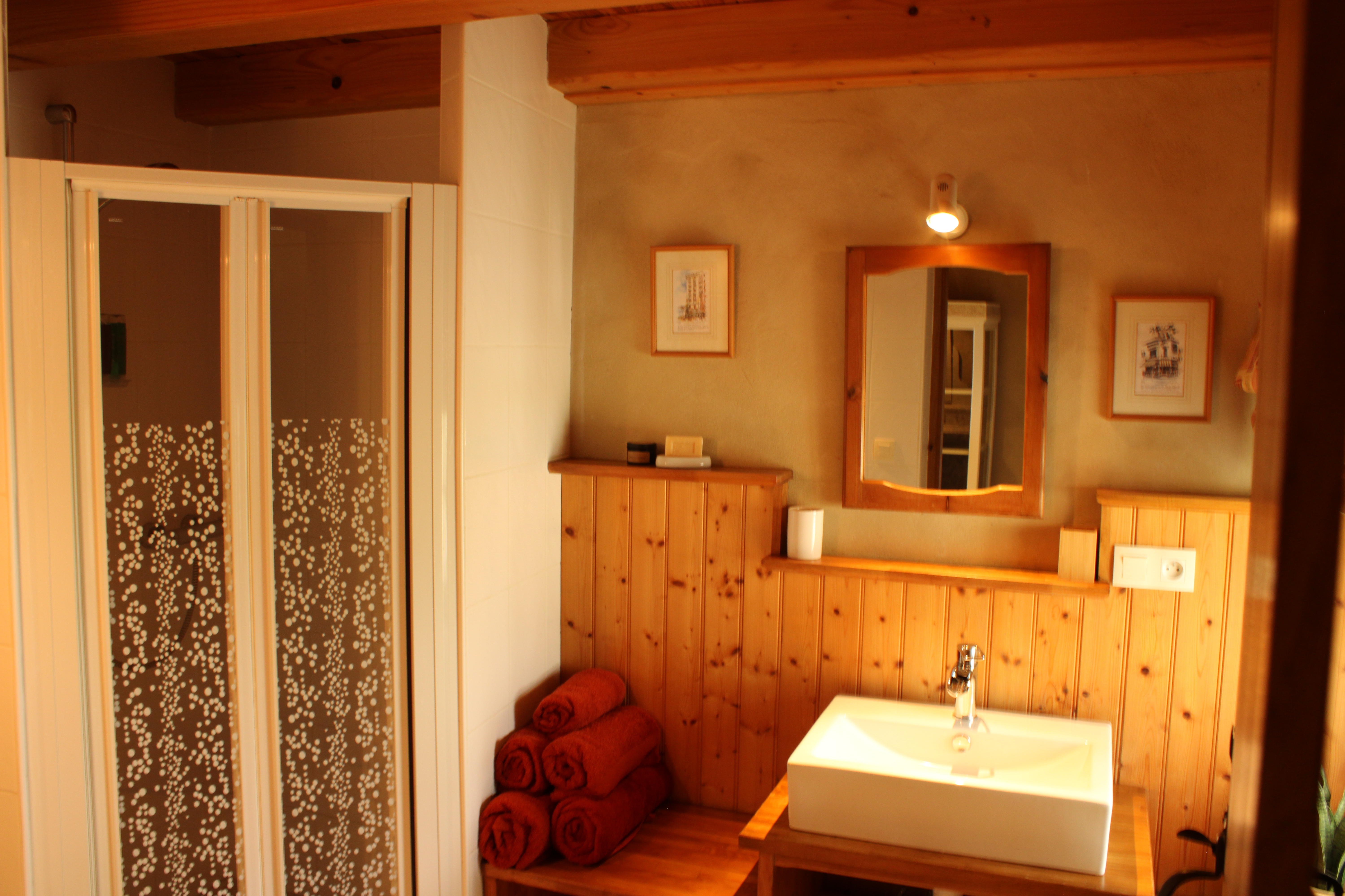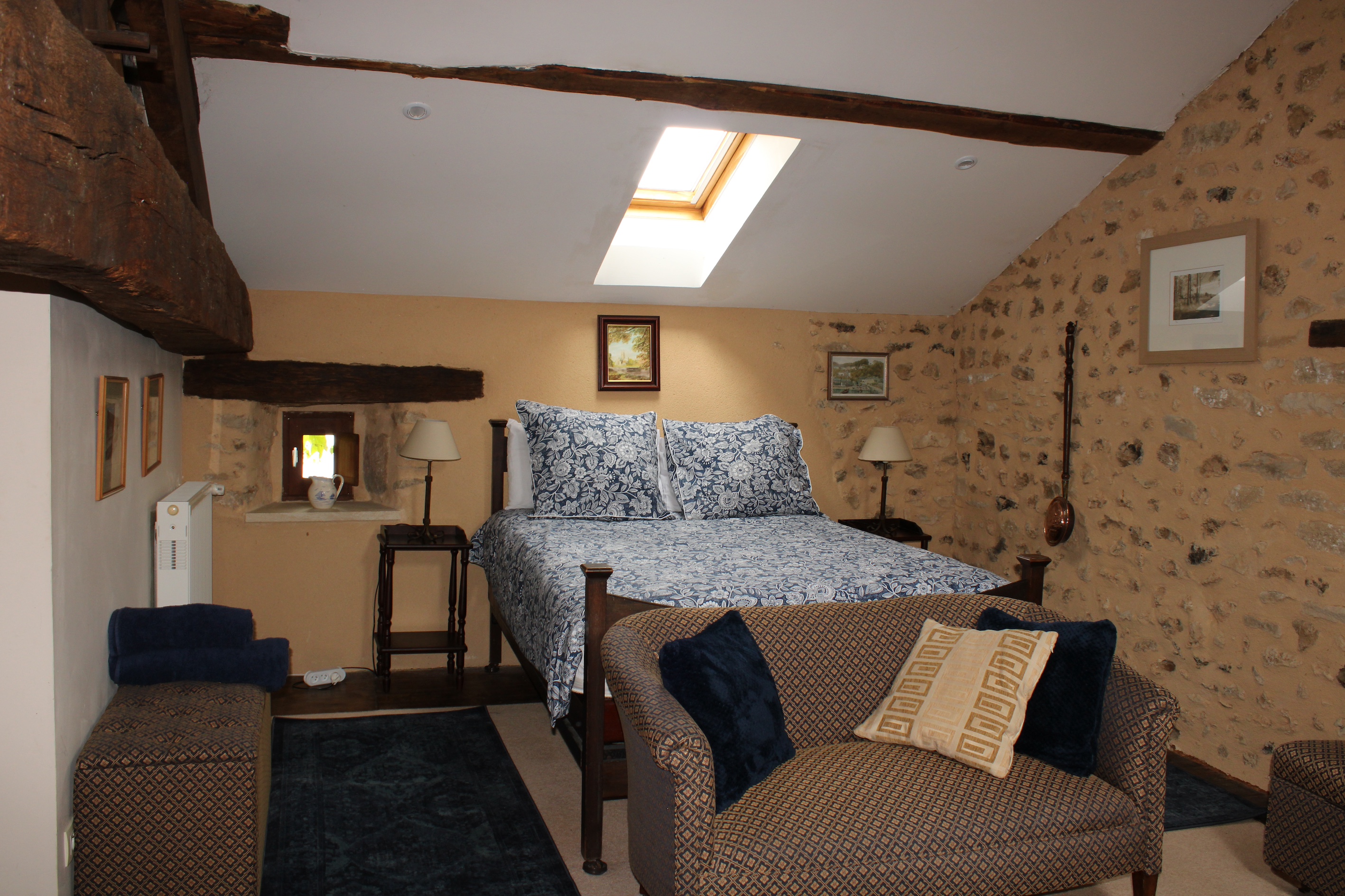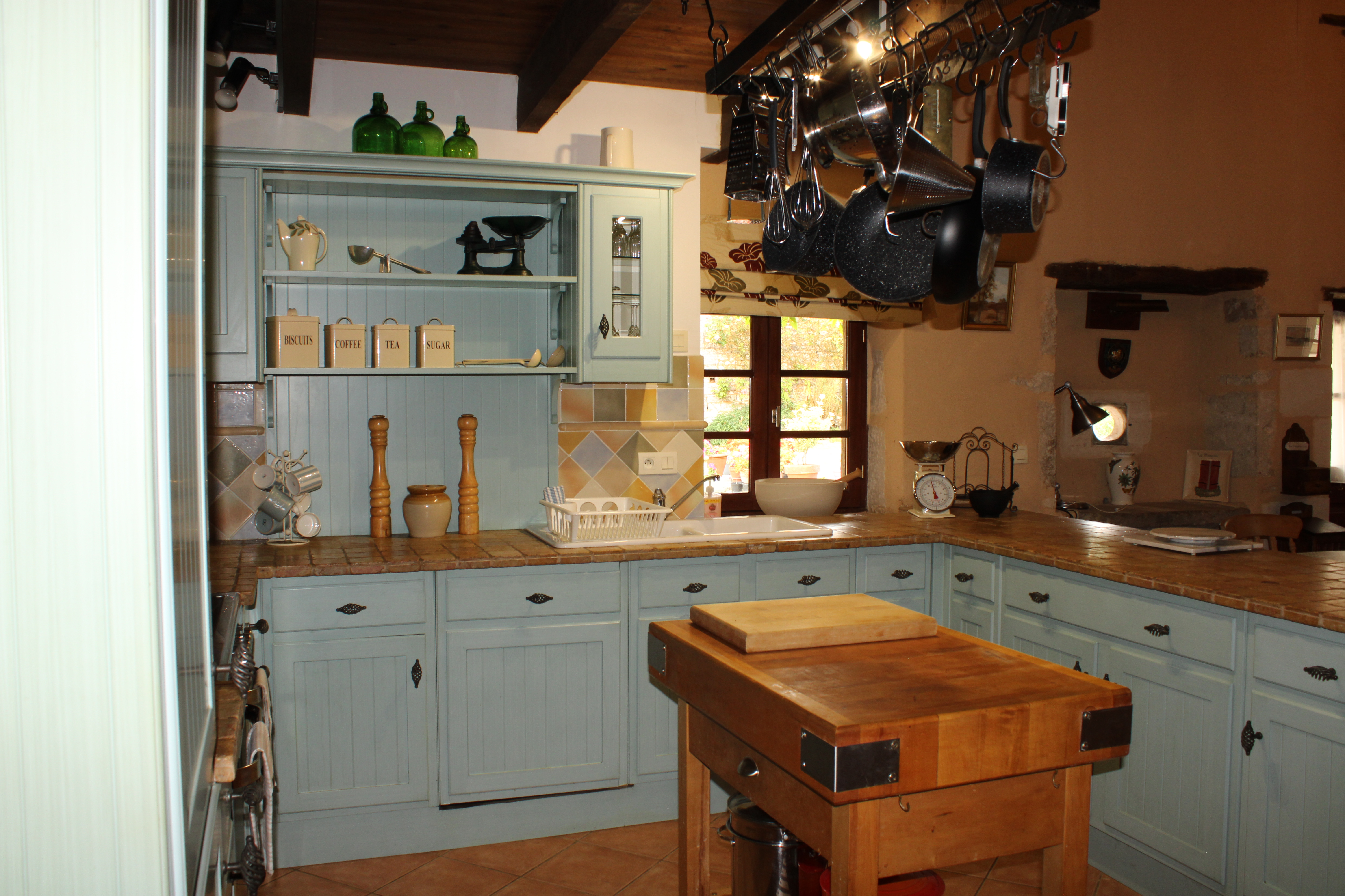 A large dining room, seating up to 10, with a large log burner joins the House and the Gite together, with south facing french doors all around the property opening onto the terrace for outdoor dining.